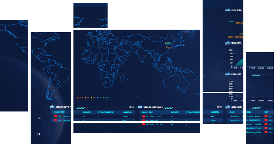 通过多样化的图表形式呈现网络安全态势、安全事件列表、威胁检测报告以及基础事件和日志,生成图形报表,提供可视化辅助分析工具,监控并呈现系统自身状态。